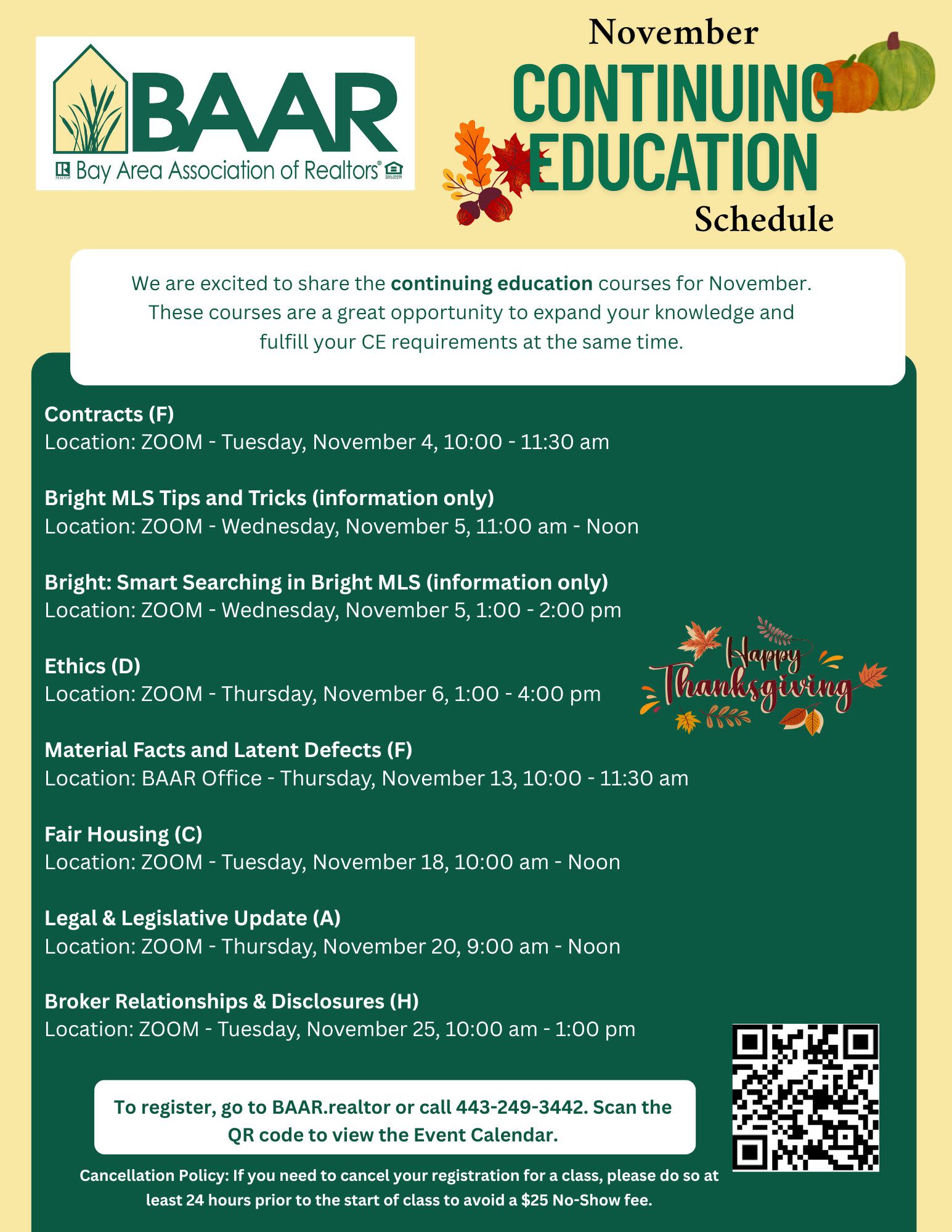 The BAAR Continuing Education Calendar outlines the class schedule of classes you need to fulfill your biannual renewal requirements. We offer in person classes at the BAAR Office, The Peoples Bank in Chestertown, and The Sheriff's Office in Centreville. You can also take CE classes online thru TheCEShop.com