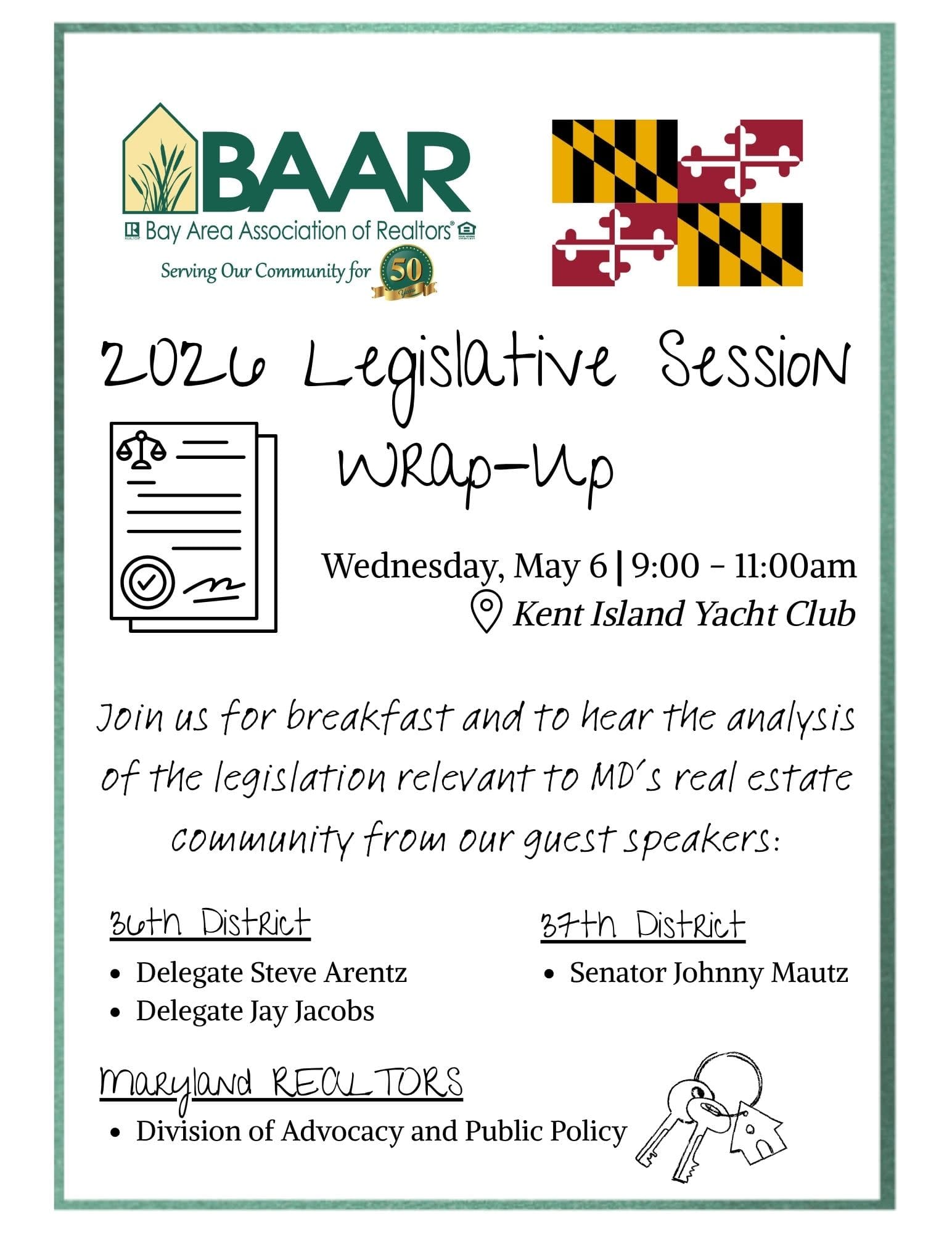 Join us for breakfast and to hear the analysis of the legislation relevant to MD’s real estate community from our guest speakers, Senator Johnny Mautz, Delegate Steve Arentz, Delegate Jay Jacobs, and a representative from Maryland REALTORS' Division of Advocacy and Public Policy.